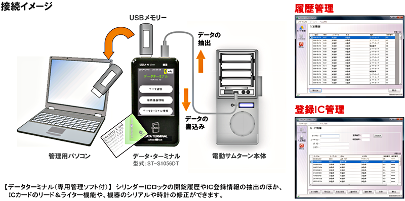 ICでの開錠履歴だけではなく、従来のシリンダー鍵での開錠も識別し、履歴を残します。 電動サムターン本体に記憶した開錠履歴を抽出する機能を装備。本体のミニUSBポートとデータ・ターミナルを接続して履歴を抽出し、USBメモリーに保管します。USBメモリーのデータ管理はパソコンの専用ソフトで行います。